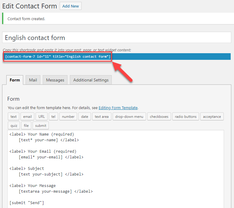 Чтобы создать форму, перейдите на страницу Контакты -> Добавить новую . По завершении вы получите шорткод для вашей контактной формы. Скопируйте это.